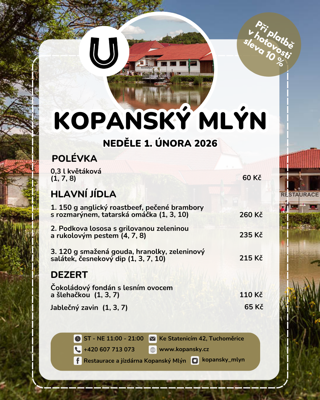 Restaurace Kopanský mlýn vznikla přístavbou k původnímu mlýnu, který zde na Únětickém potoce stál již v 17.století. Proto jsme zachovali stejný název, i když dnešní využití objektu je zaměřeno na provoz restaurace a ustájení sportovních koní. Rozloha restaurace je ideální pro pořádání oslav, svateb a dalších akcí. Kapacita je 60 míst uvnitř restaurace, 20 míst na zastřešené terase a 30 venkovních míst.