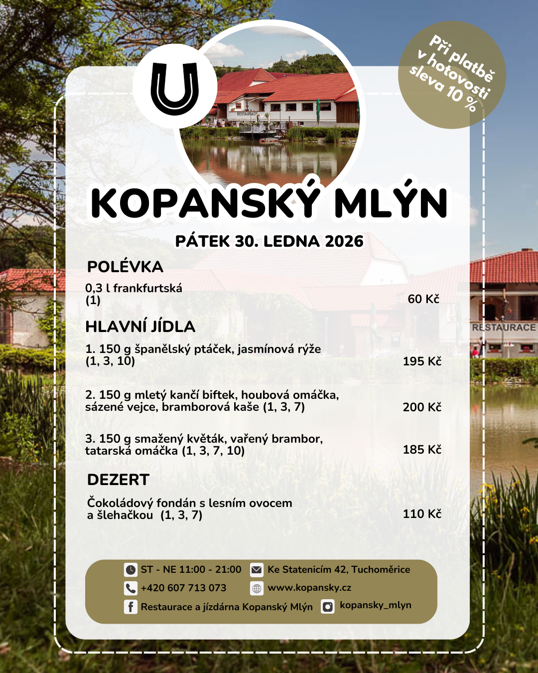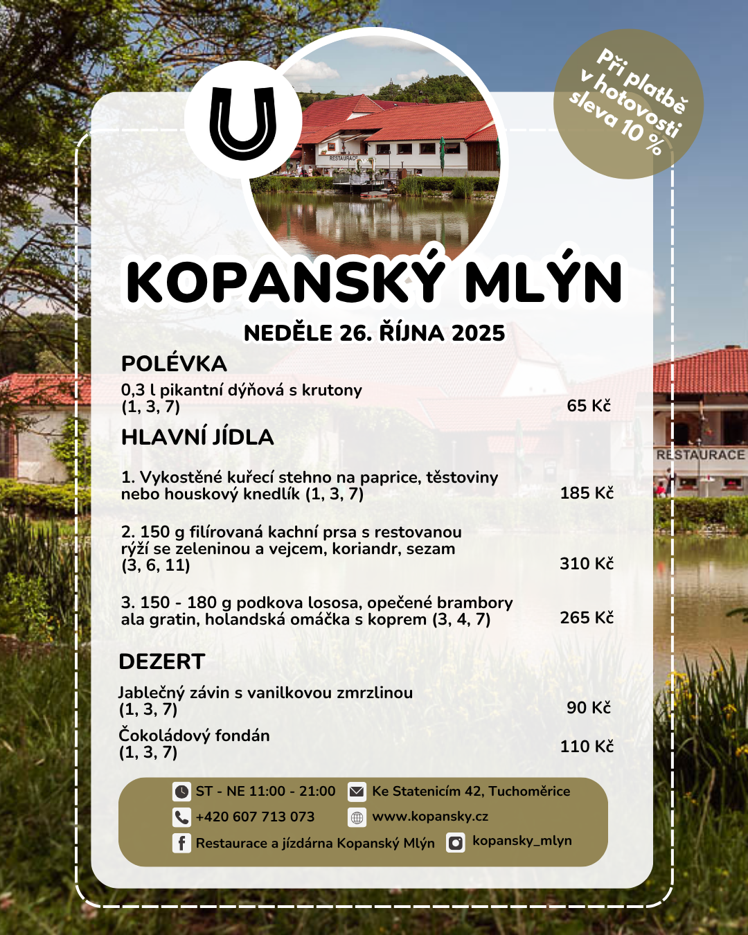 Restaurace Kopanský mlýn vznikla přístavbou k původnímu mlýnu, který zde na Únětickém potoce stál již v 17.století. Proto jsme zachovali stejný název, i když dnešní využití objektu je zaměřeno na provoz restaurace a ustájení sportovních koní. Rozloha restaurace je ideální pro pořádání oslav, svateb a dalších akcí. Kapacita je 60 míst uvnitř restaurace, 20 míst na zastřešené terase a 30 venkovních míst.